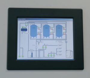 Touch panel i styretavle. Skærmbilledet viser skematisk opbygning af filteranlægget.
