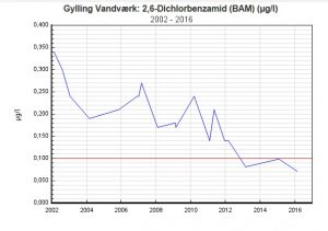 aftager, og da der ikke sker tilførsel til grundvandet, vil det være et spørgsmål om tid, inden stoffet igen er væk fra grundvandsmagasinet. Det anbefales at undersøge mulighederne for afhjælpende foranstaltninger. Højst tilladelige værdi: 0,1 μg/l.