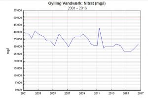 Med hensyn til nitrat er udviklingen stabil, og drikkevandet ligger på ca. 30 mg/l – altså ca. 60 % af grænseværdien. Tendensen er ikke stigende. Den samlede risikovurdering mht. BAM og nitrat er derfor, at Gylling Vandværk har en forholdsvis sikker kildeplads. Den største usikkerhed er kommunens utætte kloakledning.